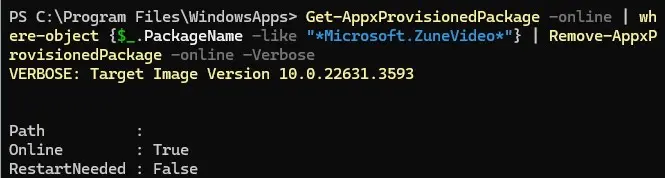 Get-AppxProvisionedPackage -Online | Where-Object {$_.PackageName -like "*Microsoft.ZuneVideo*"} | Remove-AppxProvisionedPackage -Online -Verbose