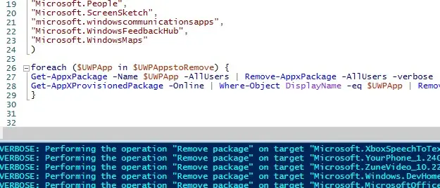 Get-AppxProvisionedPackage -Online | Where-Object {$_.DisplayName -eq $UWPApp} | Remove-AppxProvisionedPackage -Online -Verbose