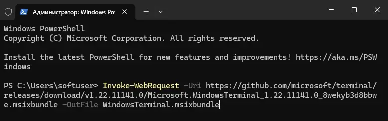 Invoke-WebRequest -Uri https://github.com/microsoft/terminal/releases/download/v1.22.11141.0/Microsoft.WindowsTerminal_1.22.11141.0_8wekyb3d8bbwe.msixbundle -OutFile WindowsTerminal.msixbundle