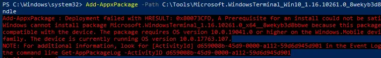 Windows cannot install package because this package requires OS version 10.0.19041.0 or higher.