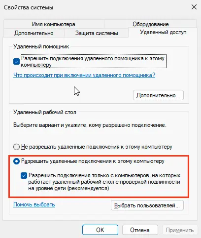 3. Для повышения безопасности активируйте Разрешить подключение только с компьютеров, на которых работает удаленный рабочий стол с проверкой подлинности на уровне сети (NLA).