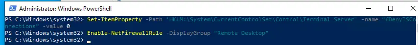 Set-ItemProperty -Path 'HKLM:\System\CurrentControlSet\Control\Terminal Server' -Name "fDenyTSConnections" -Value 0