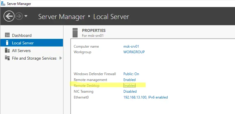 – Через Диспетчер серверов -> Локальный сервер -> Удаленный рабочий стол.