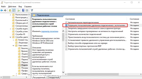 4. Включите политику Разрешить пользователям подключаться удаленно с помощью служб удаленного рабочего стола (установите Включено).