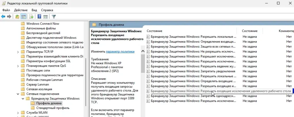 5. Для брандмауэра активируйте правило в разделе Конфигурация компьютера -> Административные шаблоны -> Сеть -> Сетевые подключения -> Брандмауэр Windows -> Доменный профиль -> Разрешить входящие исключения для удаленного рабочего стола.