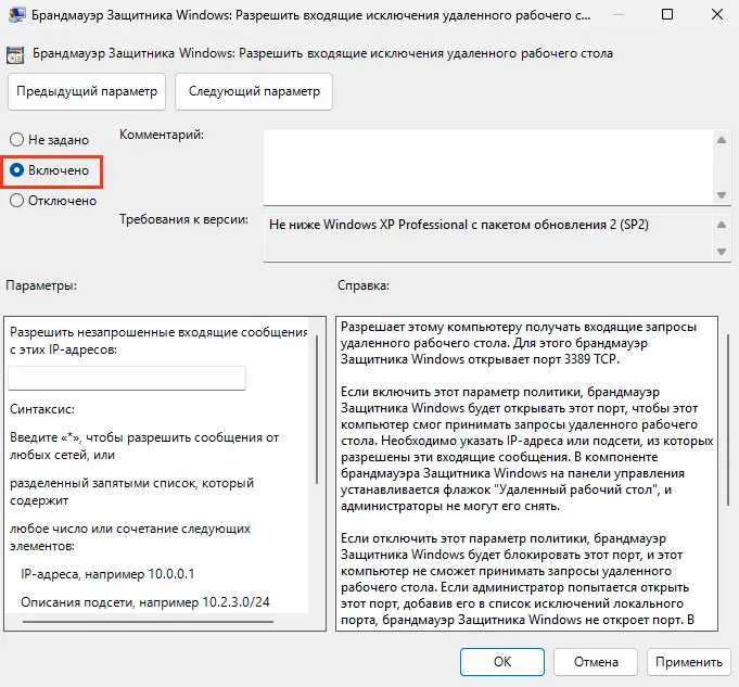 Если включен Брандмауэр Защитника Windows, убедитесь, что входящие RDP-подключения разрешены (порт TCP 3389, а в новых версиях также UDP 3389).