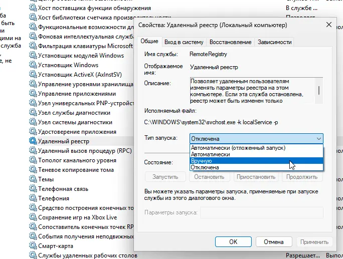 – Найдите службу Удаленный реестр, установите тип запуска Вручную и запустите её.