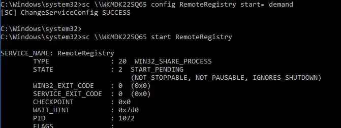 sc \\WKMDK22SQ65 config RemoteRegistry start= demand