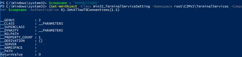 $compname = "WKMDK22SQ65"; (Get-WmiObject -Class Win32_TerminalServiceSetting -Namespace root\CIMV2\TerminalServices -Computer $compname -Authentication 6).SetAllowTSConnections(1,1)