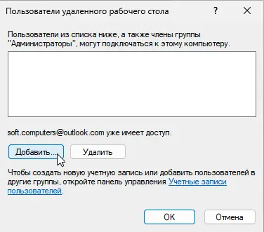 2. Добавленные пользователи автоматически включаются в группу Пользователи удаленного рабочего стола.