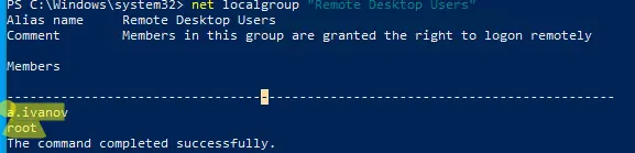 Add-LocalGroupMember -Group "Пользователи удаленного рабочего стола" -Member 'a.petrov'