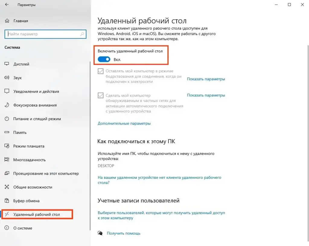 1. Перейдите в Параметры -> Система -> Удаленный рабочий стол.