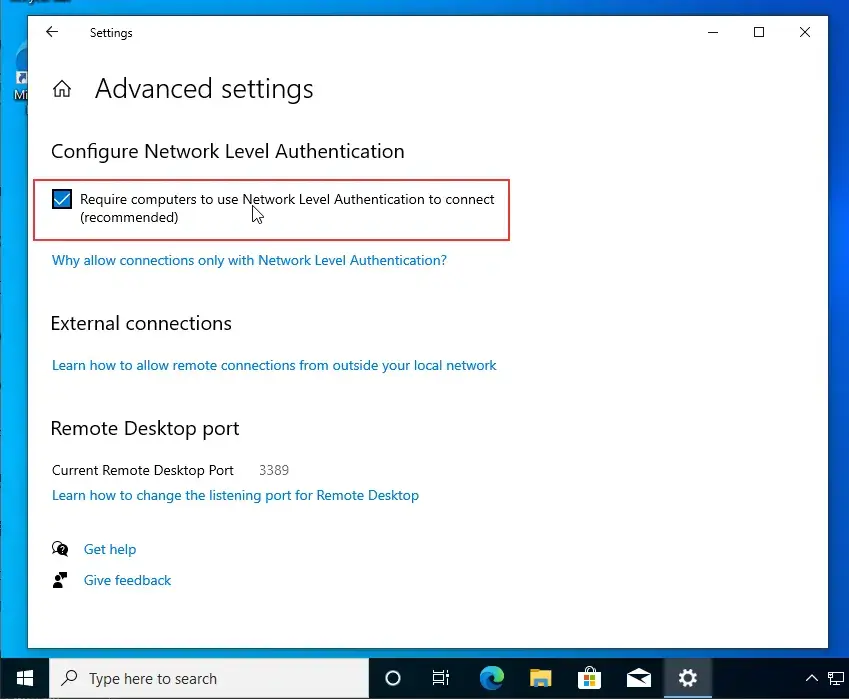 В разделе Дополнительные параметры включите NLA для повышения безопасности.