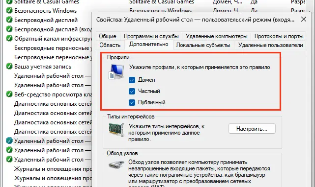 2. Убедитесь, что правило Удаленный рабочий стол активно для профилей Частная сеть и, при необходимости, Публичная.
