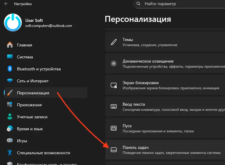 2. Перейдите в раздел Персонализация → Панель задач (Personalization → Taskbar).