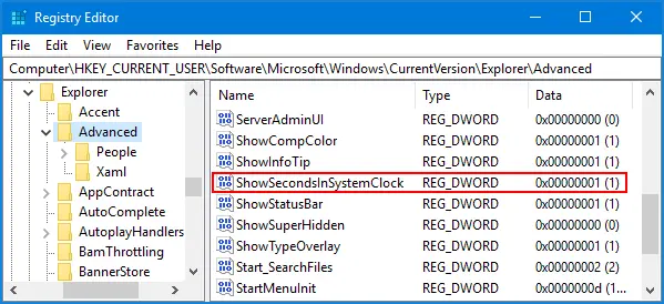 – Найдите или создайте параметр DWORD ShowSecondsInSystemClock и назначьте ему значение 1.