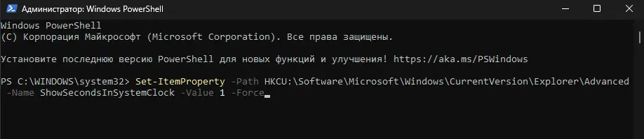 Set-ItemProperty -Path HKCU:\Software\Microsoft\Windows\CurrentVersion\Explorer\Advanced -Name ShowSecondsInSystemClock -Value 1 -Force