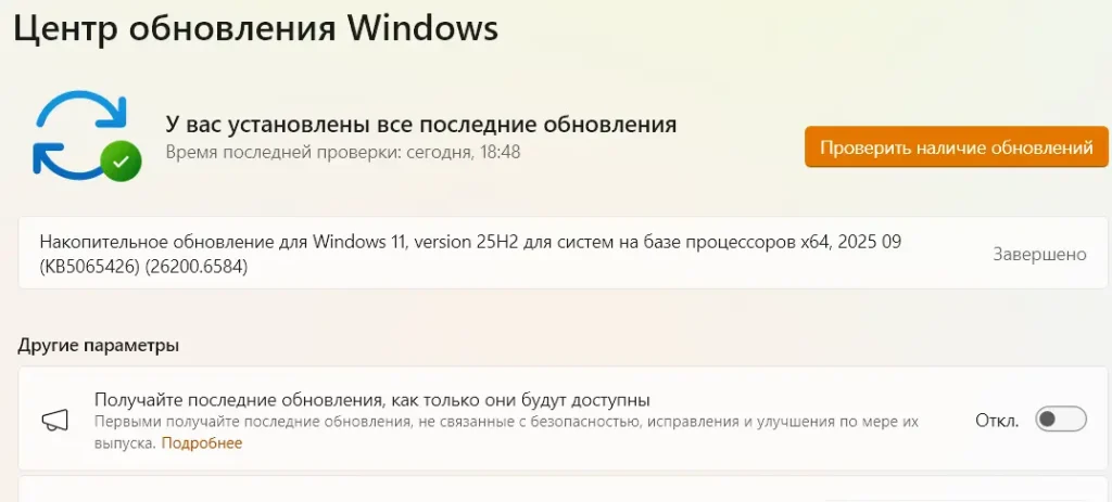 1. Проверьте версию Windows → Параметры → Система → Обновление Windows и убедитесь, что установлено KB5065426 или выше.