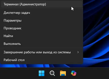 1. Откройте командную строку от имени администратора (Win+X → «Терминал (администратор)»).