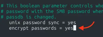 – Включить шифрование трафика, установив encrypt passwords = yes
