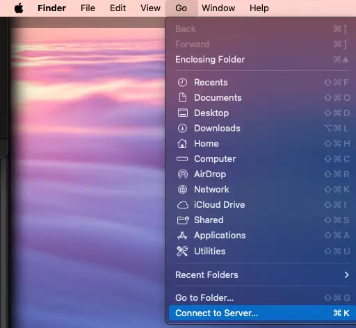 На Mac откройте Finder и в меню “Переход” выберите “Подключение к серверу”. Введите: