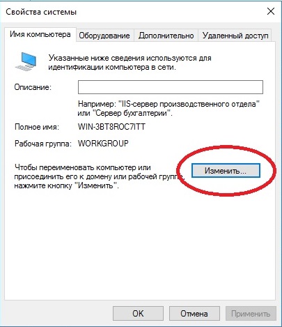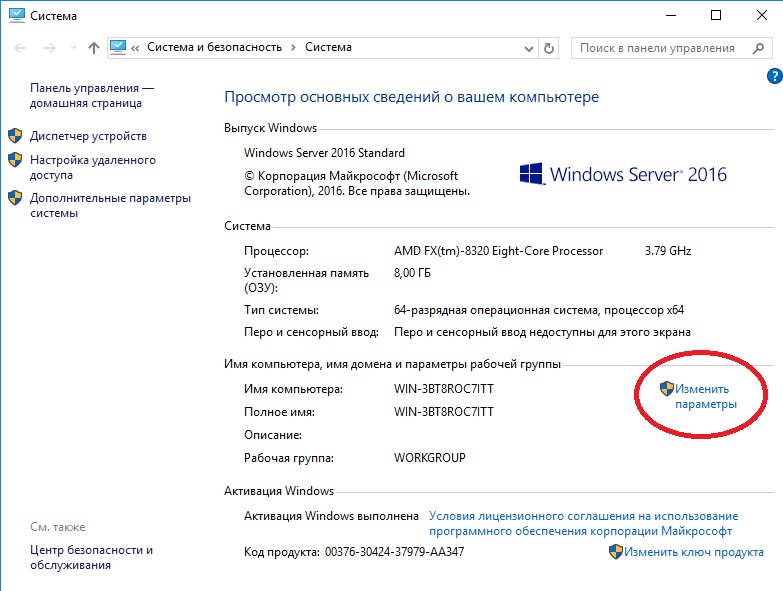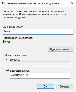 Итак, приступим. Для начала нам нужно задать имя нашему серверу, для этого заходим в свойства системы => изменить параметры => изменить. Задаем “Имя компьютера”, и если нужно, то имя рабочей группы. После изменения параметров нужно перезагрузиться.