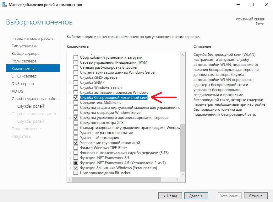 В компонентах оставляем по стандарту следующие пункты. Мы рекомендуем вам дополнительно установить “Службу беспроводной локальной сети”, т.к без этой службы на сервер нельзя будет поставить Wi-Fi адаптер и производить настройку беспроводной сети.