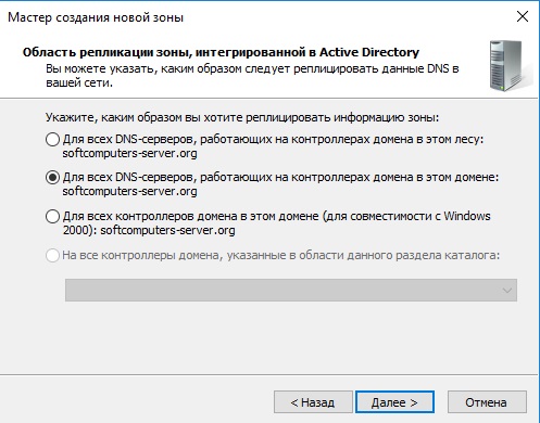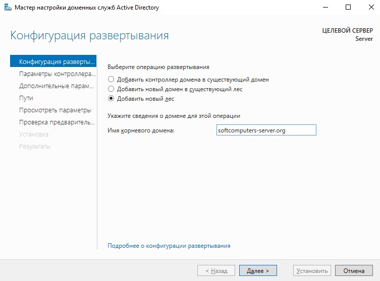 Выбираем пункт “Добавить новый лес” и придумываем имя Вашему домену. На нашем примере это будет “softcomputers”.