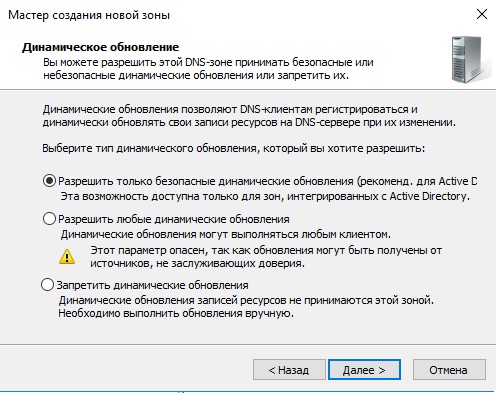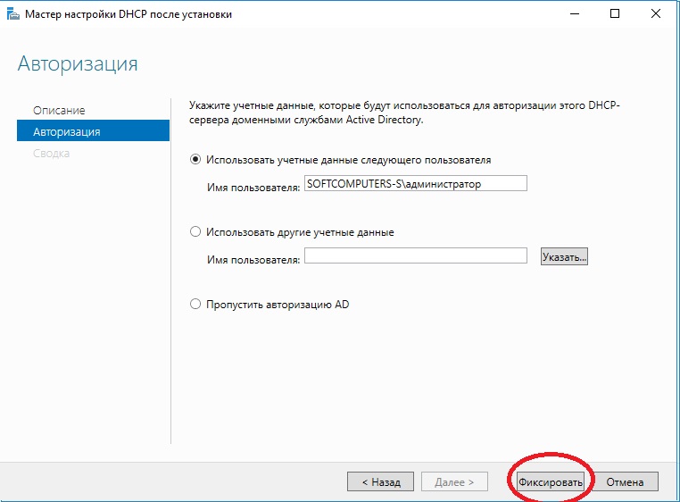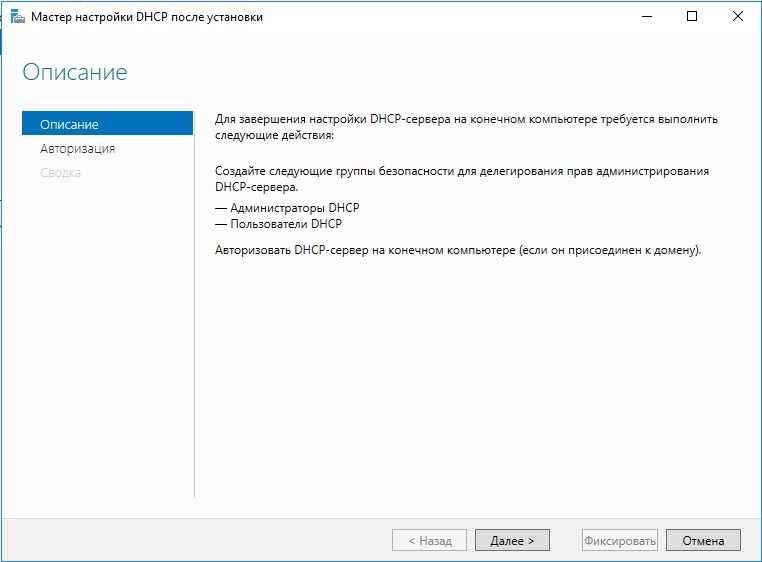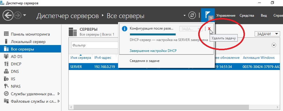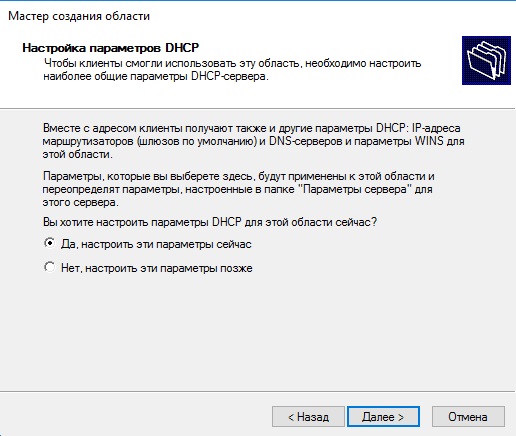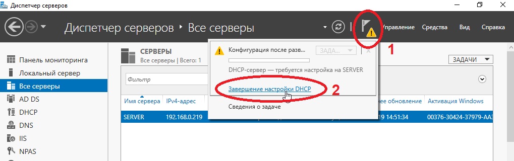 На этом настройки DNS закончены. Приступим к настройкам DHCP. Так же заходим в Active Directory и во флажке справа на верху выбираем соответствующую настройку.