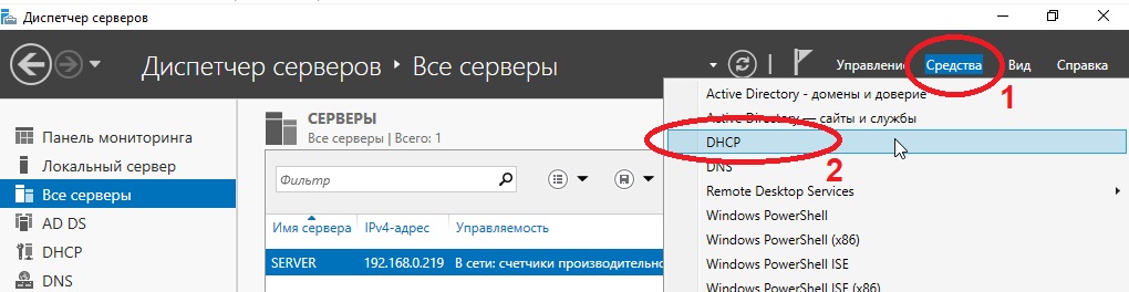 После создания DHCP переходим в меню средства => DHCP для его настройки.
