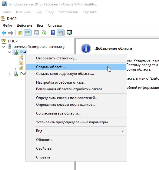 В древе DHCP => Ваш сервер => IPv4 => Правой кнопкой мыши => Создать область.