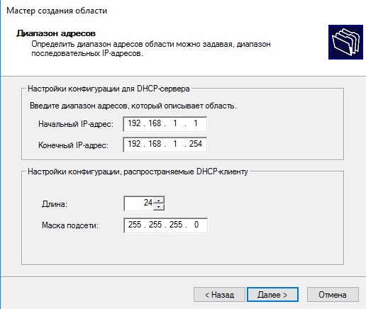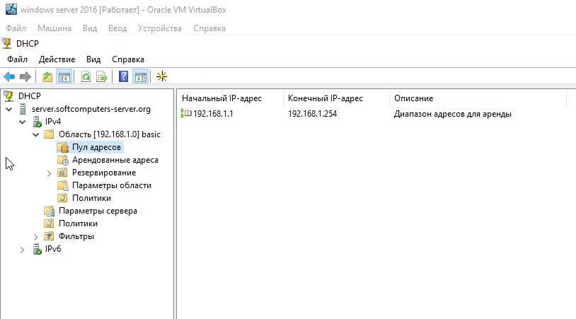 Далее в древе DHCP => Имя сервера => Область => Пул адресов – будет создан новый диапазон.