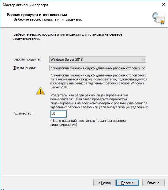 Далее в зависимости от лицензии она может определиться сразу на 50 пользователей, либо Вам нужно будет это указать самим как на скриншоте ниже. (указав больше пользователей, чем позволяет лицензия – данная настройка просто не активируется). Тип лицензии соответственно выбираем “По пользователю”.