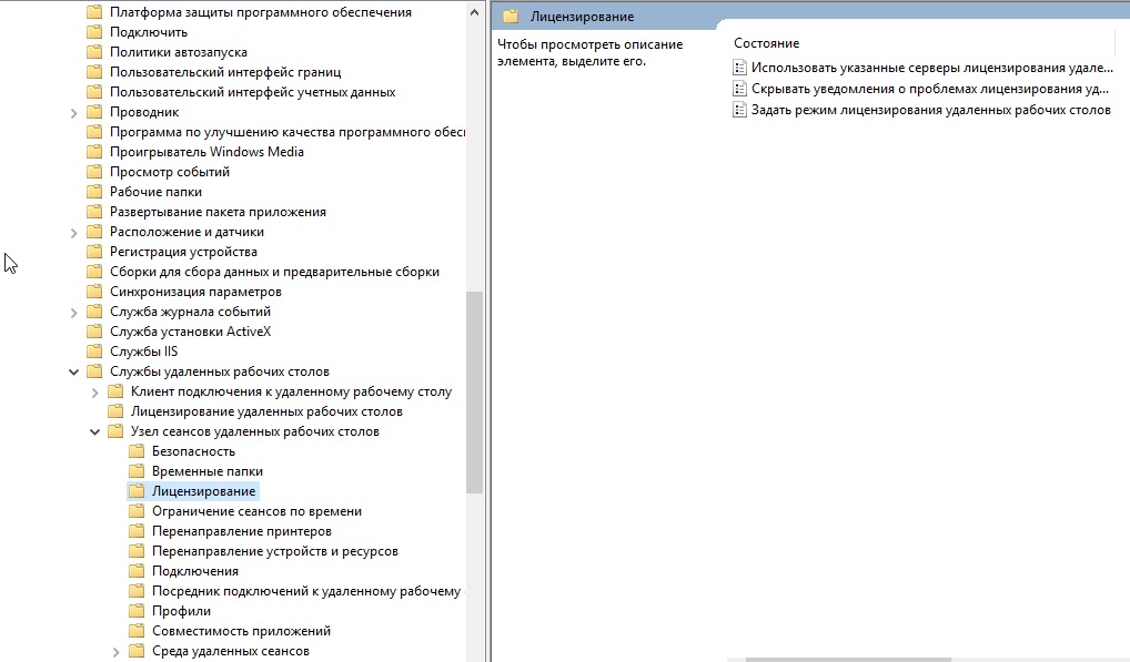 Далее заходим в редактор локальной групповой политики поиск => gpedit.msc => Конфигурация компьютера => Административные шаблоны => Компоненты Windows => Службы удаленных рабочих столов => Узел сеансов удаленных рабочих столов => Лицензирование.