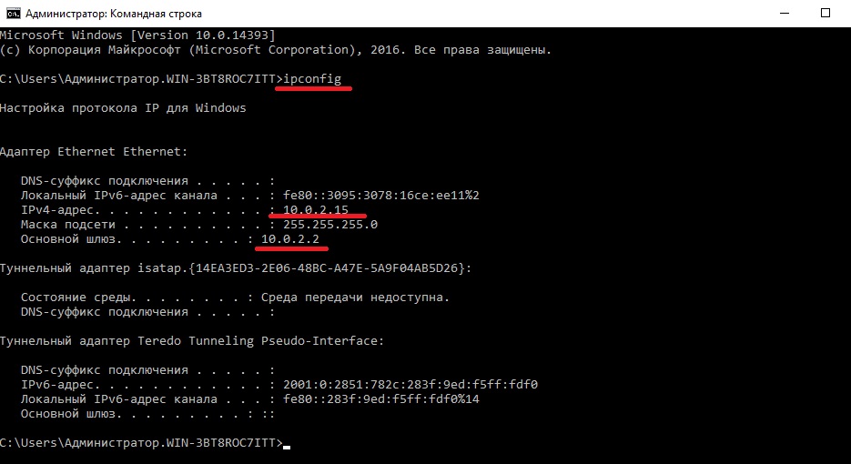 После нам нужно задать сетевые настройки. Если у Вас сервер подключен к маршрутизатору, то задаем IP шлюза, вводим статический адрес, это обязательно для сервера и маску подсети. Информацию об IP адресах в Вашей локальной сети можно посмотреть через командную строку командной “ipconfig”. Ниже на скриншотах указаны примеры, у Вас IP адреса будут отличаться.