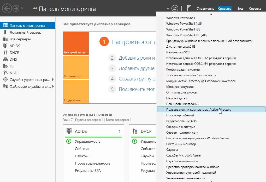 Перейдем наконец к самым главным настройкам, к Active Directory. Меню “Пуск” => Диспетчер серверов.