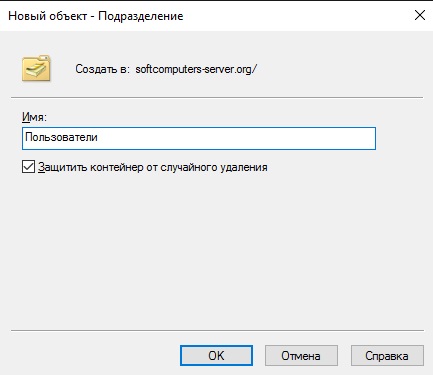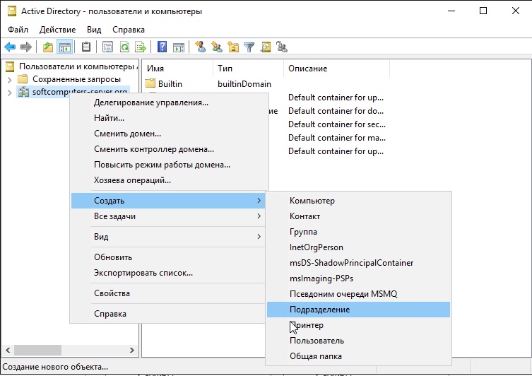 В правом списке выбираете Ваш сервер => Правой кнопкой мыши => Создать => Подраздаление. В этом меню мы создадим пул, в котором будет содержаться список наших пользователей.