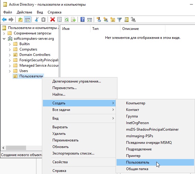 Далее в новой созданной папке слева в списке => Правой кнопкой мыши => Создать => Пользователь.