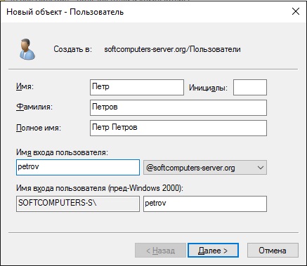 Опционально вводим ФИО пользователя и обязательно имя для входа, желательно это делать на латинице.