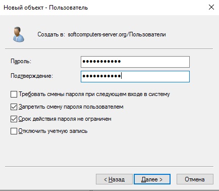 В следующем окне задаем пароль для пользователя поставив соответствующие галки.