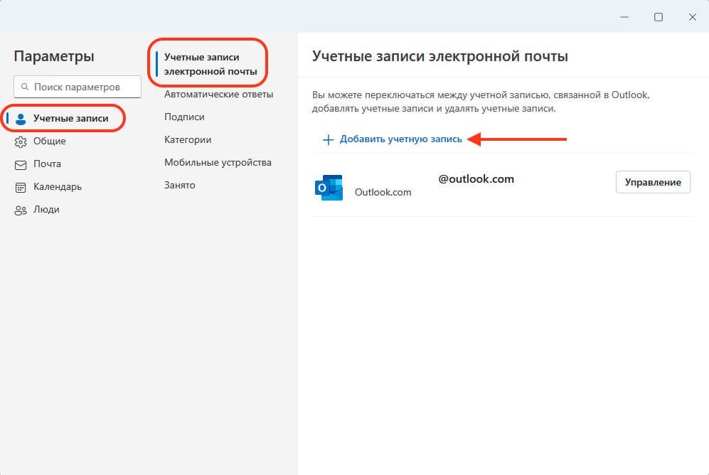 2) Далее “Учетные записи” => “Учетные записи электронной почты”, после чего нажимаем “Добавить учетную запись”.