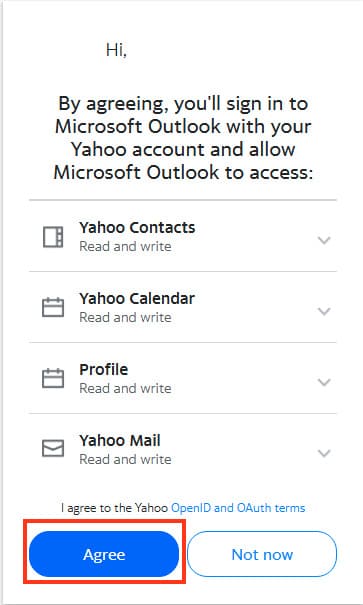 5) Входите в свой аккаунт yahoo, в конце нажимаете “Согласен” (Agree), после чего вас перенаправит обратно в Outlook.