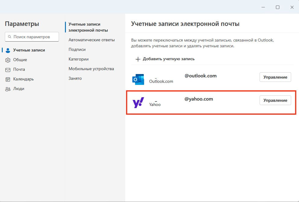 Как мы можем видеть теперь у нас подключена почта Yahoo к нашему Outlook, без надобности что либо вводить самому.