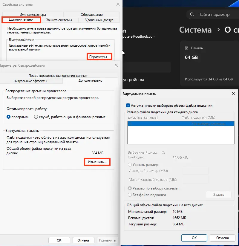 – Настройте виртуальную память (pagefile) вручную, установив размер файла подкачки равным объёму ОЗУ × 1,5.