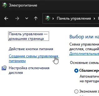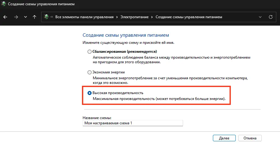 Панель управления → Электропитание → Создать план электропитания → Высокая производительность