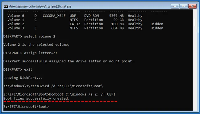 bcdboot C:\Windows /s Z: /f UEFI