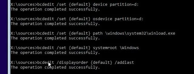 Если команда /RebuildBcd не находит установки, можно далее прописать BCD вручную через bcdedit:
