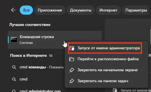 1. Нажмите «Пуск», введите cmd, нажмите правой кнопкой мыши на «Командная строка» и выберите «Запуск от имени администратора».