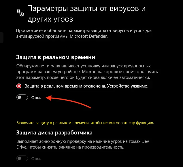 3. Переведите переключатель «Защита в режиме реального времени» в положение Выкл.