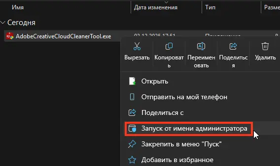 2. Нажмите правой кнопкой мыши на скачанный файл и выберите «Запуск от имени администратора».